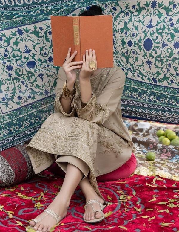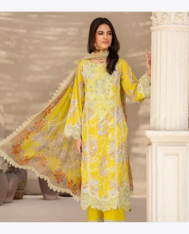 - Sheer organza dupatta, offering a light and airy, ethereal quality.